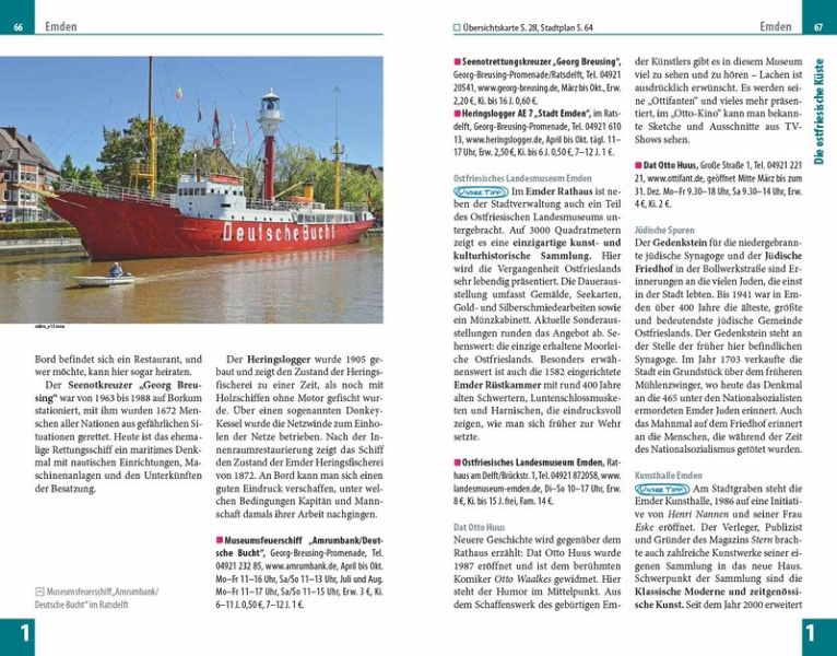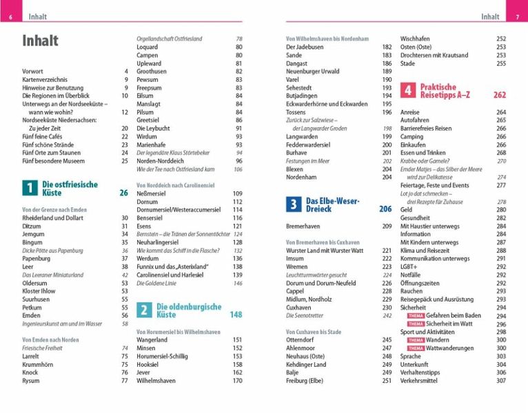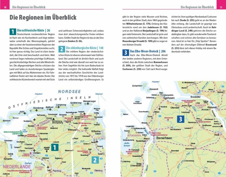 - Übersichtsseiten mit Beschreibungen aller Regionen: die ostfriesische Küste von der Grenze bis Emden, die oldenburgische Küste von Horumersiel bis Wilhelmshaven, das Elbe-Weser-Dreieck von Bremerhaven bis Cuxhaven