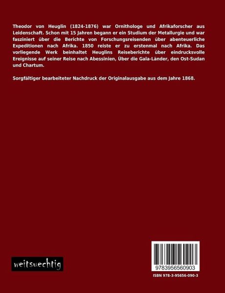 Theodor von Heuglin (1824-1876) war Ornithologe und Afrikaforscher aus Leidenschaft. Schon mit 15 Jahren begann er ein Studium der Metallurgie und war fasziniert über die Berichte von Forschungsreisenden über abenteuerliche Expeditionen nach Afrika. 1850 reiste er zu erstenmal nach Afrika. Das vorliegende Werk beinhaltet Heuglins Reiseberichte über eindrucksvolle Ereignisse auf seiner Reise nach Abessinien, Über die Gala-Länder, den Ost-Sudan und Chartum.