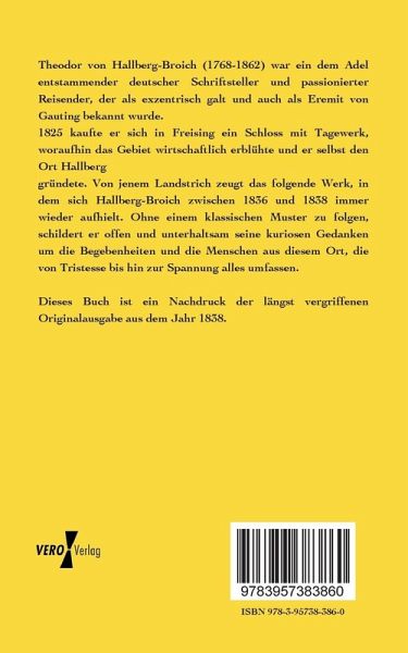 gründete. Von jenem Landstrich zeugt das folgende Werk, in dem sich Hallberg-Broich zwischen 1836 und 1838 immer wieder aufhielt. Ohne einem klassischen Muster zu folgen, schildert er offen und unterhaltsam seine kuriosen Gedanken um die Begebenheiten und die Menschen aus diesem Ort, die von Tristesse bis hin zur Spannung alles umfassen.