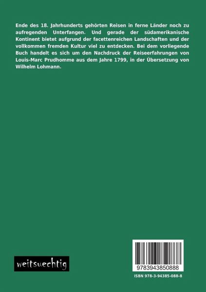Ende des 18. Jahrhunderts gehörten Reisen in ferne Länder noch zu aufregenden Unterfangen. Und gerade der südamerikanische Kontinent bietet aufgrund der facettenreichen Landschaften und der vollkommen fremden Kultur viel zu entdecken. Bei dem vorliegende Buch handelt es sich um den Nachdruck der Reiseerfahrungen von Louis-Marc Prudhomme aus dem Jahre 1799, in der Übersetzung von Wilhelm Lohmann.