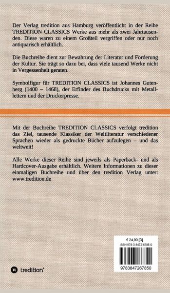 Diese Hardcover-Ausgabe ist Teil der TREDITION CLASSICS. Der Verlag tredition aus Hamburg veröffentlicht in der Buchreihe TREDITION CLASSICS Werke aus mehr als zwei Jahrtausenden. Diese waren zu einem Großteil vergriffen oder nur noch antiquarisch erhältlich. Mit TREDITION CLASSICS verfolgt tredition das Ziel, tausende Klassiker der Weltliteratur verschiedener Sprachen wieder als gedruckte Bücher zu verlegen und das weltweit! Die Buchreihe dient zur Bewahrung der Literatur und Förderung der Kultur. Sie trägt so dazu bei, dass viele tausend Werke nicht in Vergessenheit geraten.