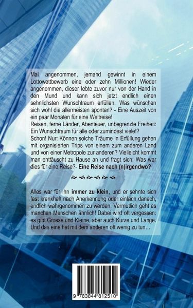 Mal angenommen, jemand gewinnt in einem Lottowettbewerb eine oder zehn Millionen! Wieder angenommen, dieser lebte zuvor nur von der Hand in den Mund und kann sich jetzt endlich einen sehnlichsten Wunschtraum erfüllen. Was wünschen sich wohl die allermeisten spontan? - Eine Auszeit von ein paar Monaten für eine Weltreise! Reisen, ferne Länder, Abenteuer, unbegrenzte Freiheit: Ein Wunschtraum für alle oder zumindest viele!?Schon! Nur: Können solche Träume in Erfüllung gehen mit organisierten Trips von einem zum anderen Land und von einer Metropole zur anderen? Vielleicht kommt man enttäuscht zu Hause an und fragt sich: Was war dies für eine Reise?- Eine Reise nach (n)irgendwo?Alles war für ihn immer zu klein, und er sehnte sich fast krankhaft nach Anerkennung oder einfach danach, endlich wahrgenommen zu werden. Vermutlich geht es manchen Menschen ähnlich! Dabei wird oft vergessen: es gibt Grosse und Kleine, aber auch Kurze und Lange. Und das eine hat mit dem anderen oft wenig zu tun...