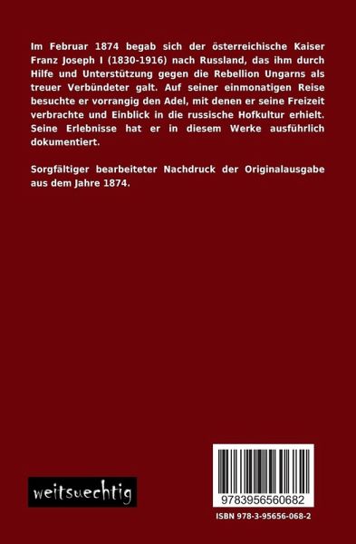 Im Februar 1874 begab sich der österreichische Kaiser Franz Joseph I (1830-1916) nach Russland, das ihm durch Hilfe und Unterstützung gegen die Rebellion Ungarns als treuer Verbündeter galt. Auf seiner einmonatigen Reise besuchte er vorrangig den Adel, mit denen er seine Freizeit verbrachte und Einblick in die russische Hofkultur erhielt. Seine Erlebnisse hat er in diesem Werke ausführlich dokumentiert.