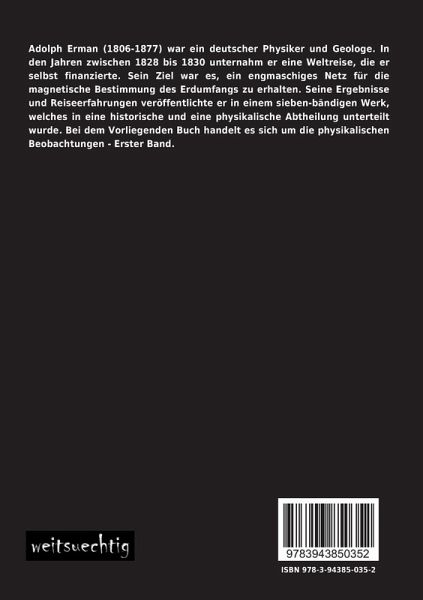 Adolph Erman (1806-1877) war ein deutscher Physiker und Geologe. In den Jahren zwischen 1828 bis 1830 unternahm er eine Weltreise, die er selbst finanzierte. Sein Ziel war es, ein engmaschiges Netz für die magnetische Bestimmung des Erdumfangs zu erhalten. Seine Ergebnisse und Reiseerfahrungen veröffentlichte er in einem sieben-bändigen Werk, welches in eine historische und eine physikalische Abtheilung unterteilt wurde. Bei dem Vorliegenden Buch handelt es sich um die physikalischen Beobachtungen - Erster Band.