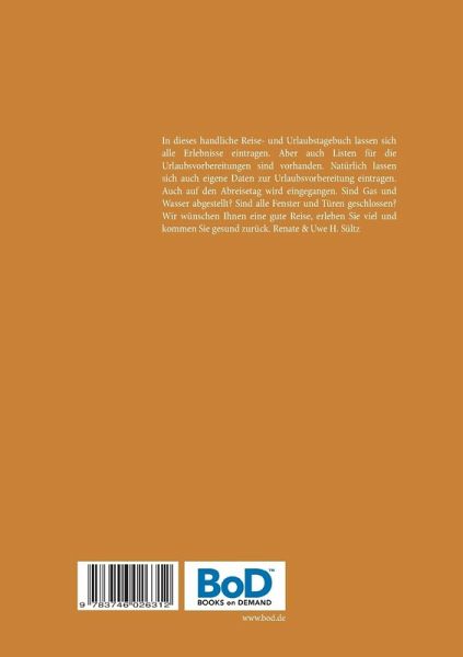 In dieses handliche Reise- und Urlaubstagebuch lassen sich alle Erlebnisse eintragen. Aber auch Listen für die Urlaubsvorbereitungen sind vorhanden. Natürlich lassen sich auch eigene Daten zur Urlaubsvorbereitung eintragen. Auch auf den Abreisetag wird eingegangen. Sind Gas und Wasser abgestellt? Sind alle Fenster und Türen geschlossen? Wir wünschen Ihnen eine gute Reise, erleben Sie viel und kommen Sie gesund zurück. Renate & Uwe H. Sültz