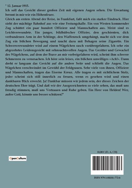 " 12. Januar 1915. Ich soll das Gesicht dieser großen Zeit mit eigenen Augen sehen. Die Erwartung brennt in mir wie ein Höhenfeuer. Gleich am ersten Abend der Reise, in Frankfurt, faßt mich ein starker Eindruck. Hier sieht der mächtige Bahnhof aus wie eine Festungshalle. Ein von Westen kommender Zug schüttet ein paar hundert Offiziere und Mannschaften aus. Meist sind es Leichtverwundete. Ein junger, bildhübscher Offizier, den geschienten, dick verbundenen Arm in der Schlinge, den Waffenrock umgehängt, macht sich vor dem Zug ein bißchen Bewegung und raucht dazu mit Behagen seine Zigarette. Ein Schwerverwundeter wird auf einem Wägelchen rasch vorübergefahren. Ich sehe ein abgezehrtes Leidensgesicht mit sehnsuchtsvollen Augen. Das Gezitter und Gewackel des Wägelchens, auf dem der Brave an mir vorbeigefahren wird, scheint ihm schwere Schmerzen zu verursachen. Ich höre sein leises, ein bißchen unwilliges »Ach!«. Dann dreht er langsam das Gesicht auf die andere Seite und schließt die Augen. Das Wägelchen verschwindet im Gewühl der Feldgrauen. Sehr viele von ihnen, Offiziere und Mannschaften, tragen das Eiserne Kreuz. Alle tragen es mit sichtlichem Stolz, jeder scheint sich still innerlich zu freuen, wenn es gesehen wird und einen dankbaren Blick erweckt. Ja! Dankbar müssen wir jedem sein, der dieses Zeichen der deutschen Ehre trägt. Und daß wir der Ausgezeichneten so viele sehen, das muß uns freudig stimmen, muß uns Vertrauen und Ruhe geben. Ein Heer von Helden! Wer, außer Gott, könnte uns besser schützen?"
