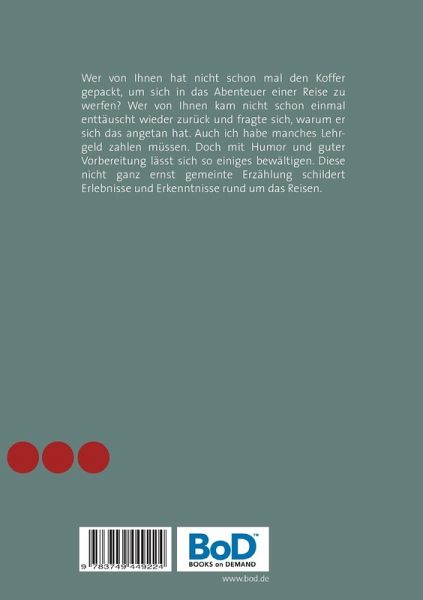 Wer von Ihnen hat nicht schon mal den Koffer gepackt, um sich in das Abenteuer einer Reise zu werfen? Wer von Ihnen kam nicht schon einmal enttäuscht wieder zurück und fragte sich, warum er sich das angetan hat. Auch ich habe manches Lehr-geld zahlen müssen. Doch mit Humor und guter Vorbereitung lässt sich so einiges bewältigen. Diese nicht ganz ernst gemeinte Erzählung schildert Erlebnisse und Erkenntnisse rund um das Reisen.
