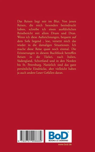 Das Reisen liegt mir im Blut. Von jenen Reisen, die mich besonders beeindruckt haben, schreibe ich einen ausführlichen Reisebericht mit allem Drum und Dran. Wenn ich diese Aufzeichnungen, bequem auf dem Sofa liegend, lese, versetzt mich das wieder in die damaligen Situationen. Ich mache diese Reise quasi noch einmal. Die Erinnerungen in diesem Buchblock betreffen Reisen in die Türkei, nach Italien, Südengland, Schottland und in den Norden bis St. Petersburg. Natürlich sind das ganz persönliche Eindrücke, aber vielleicht haben ja auch andere Leser Gefallen daran.