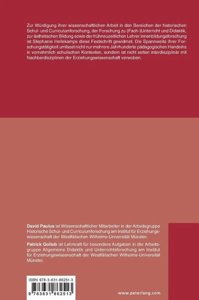 Zur Würdigung ihrer wissenschaftlichen Arbeit in den Bereichen der historischen Schul- und Curriculumforschung, der Forschung zu (Fach-)Unterricht und Didaktik, zur ästhetischen Bildung sowie der frühneuzeitlichen Lehrer:innenbildungsforschung ist Stephanie Hellekamps diese Festschrift gewidmet. Die Spannweite ihrer Forschungstätigkeit umfasst nicht nur mehrere Jahrhunderte pädagogischen Handelns in vornehmlich schulischen Kontexten, sondern ist nicht selten interdisziplinär mit Nachbardisziplinen der Erziehungswissenschaft verwoben.