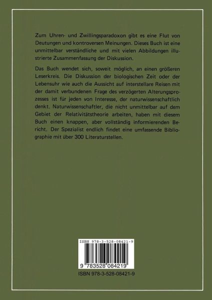 1 Einleitung.- 2 Grundlegendes zur Relativitätstheorie.- 2.1 Bringt uns den Äther nicht zurüack!.- 2.2 Michelson-Morley und wie es dazu kam.- 2.3 Die unveränderliche Lichtgeschwindigkeit.- 2.4 Das Messen von Länge und Zeit.- 2.5 Gleichzeitigkeit und die Synchronisation von Uhren.- 2.6 Die Lorentztransformation.- 2.7 Bewegte Lineale und Uhren.- 2.8 Minkowskis vierdimensionale Raum-Zeit.- 3 Das Zwillingsparadoxon.- 3.1 Das verlorene Paradoxon.- 3.2 Wir alle sind Uhren.- 3.3 Beschleunigte Uhren.- 3.4 Über den Besuch entfernter Leute.- 4 Die Zweifler.- 4.1 Das Problem der Beschleunigung.- 4.2 Über die Gleichzeitigkeit.- 4.3 Der Doppler-Effekt und der k-Kalküal.- 4.4 Wann ist eine Uhr keine Uhr?.- 4.5 Das Prinzip der Unmöglichkeit.- 4.6 Die spezielle Relativitätstheorie: richtig oder falsch?.- 5 Experimentelle Beweise.- 5.1 Vor 1950.- 5.2 Mesonen und die füanfziger Jahre.- 5.3 Der Mössbauer-Effekt und die sechziger Jahre.- 5.4 Die Verwendung von küanstlichen Erdsatelliten.- 6 Das Uhrenparadoxon in der allgemeinen Relativitätstheorie.- 6.1 Das Äquivalenzprinzip.- 6.2 Der Karussell-Zugang zur allgemeinen Relativitätstheorie.- 6.3 Und nocheinmal: das Paradoxon.- Bibliographie.- a) Das Uhrenparadoxon. Ausgewählte Zitate.- b) Andere Zitate.- Namen- und Sachwortverzeichnis.