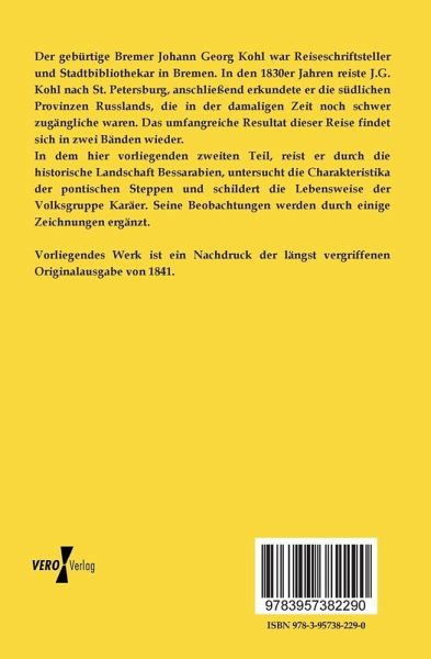 Der gebürtige Bremer Johann Georg Kohl war Reiseschriftsteller und Stadtbibliothekar in Bremen. In den 1830er Jahren reiste J.G. Kohl nach St. Petersburg, anschließend erkundete er die südlichen Provinzen Russlands, die in der damaligen Zeit noch schwer zugängliche waren. Das umfangreiche Resultat dieser Reise findet sich in zwei Bänden wieder.