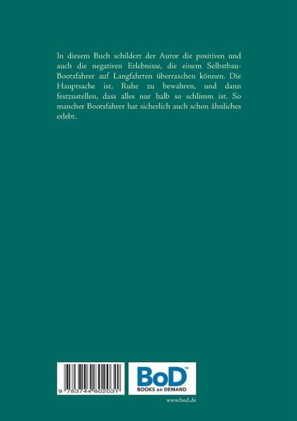 In diesem Buch schildert der Autor die positiven und auch die negativen Erlebnisse, die einem Selbstbau-Bootsfahrer auf Langfahrten überraschen können. Die Hauptsache ist, Ruhe zu bewahren, und dann festzustellen, dass alles nur halb so schlimm ist. So mancher Bootsfahrer hat sicherlich auch schon ähnliches erlebt.