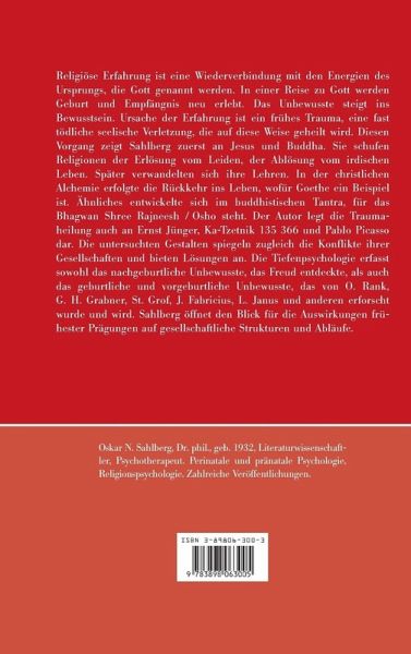 Religiöse Erfahrung ist eine Wiederverbindung mit den Energien des Ursprungs, die Gott genannt werden. In einer Reise zu Gott werden Geburt und Empfängnis neu erlebt. Das Unbewusste steigt ins Bewusstsein. Ursache der Erfahrung ist ein frühes Trauma, eine fast tödliche seelische Verletzung, die auf diese Weise geheilt wird. Diesen Vorgang zeigt Sahlberg zuerst an Buddha und Jesus. Sie schufen Religionen der Erlösung vom Leiden, der Ablösung vom irdischen Leben. Später verwandelten sich ihre Lehren. In der christlichen Alchemie erfolgte die Rückkehr ins Leben, wofür Goethe ein Beispiel ist.…mehr
