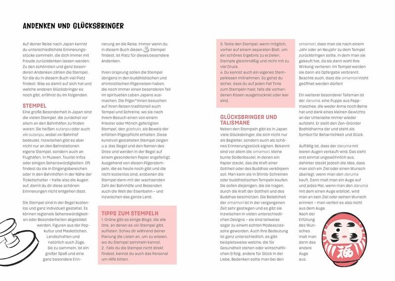 Auch bei der Reiseplanung ist das Urlaubstagebuch ein praktischer Helfer - dank Listen, Tipps und Themenseiten zur Kultur Japans. Ein besonderes Extra sind die zahlreichen Stempelseiten für die beliebten eki stamps, die du an vielen Bahnhöfen und Sehenswürdigkeiten Japans sammeln kannst.