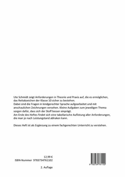 In diesem Heft sind die Anforderungen in Theorie und Praxis aufgezeigt, die es ermöglichen, das Reitabzeichen der Klasse 10 sicher zu bestehen. Dabei sind die Fragen in kindgerechter Sprache aufgearbeitet und mit anschaulichen Zeichnungen versehen. Kleine Aufgaben zum jeweiligen Thema sorgen dafür, dass sich der Stoff besser einprägt. Am Ende des Heftes findet sich eine tabellarische Auflistung aller Anforderungen, die man je nach Leistungstand abhaken kann.Dieses Heft ist als Ergänzung zu einem fachgerechten Unterricht zu verstehen.