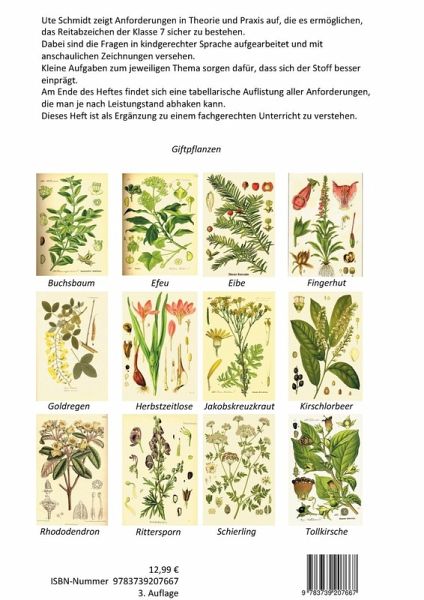 Ute Schmidt zeigt Anforderungen in Theorie und Praxis auf, die es ermöglichen, das Reitabzeichen der Klasse 7 sicher zu bestehen. Dabei sind die Fragen in kindgerechter Sprache aufgearbeitet und mit anschaulichen Zeichnungen versehen. Kleine Aufgaben zum jeweiligen Thema sorgen dafür, dass sich der Stoff besser einprägt. Am Ende des Heftes findet sich eine tabellarische Auflistung aller Anforderungen, die man je nach Leistungsstand abhaken kann.Dieses Heft ist als Ergänzung zu einem fachgerechten Unterricht zu verstehen.