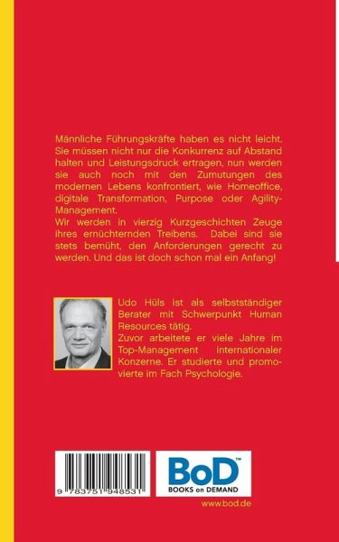 Männliche Führungskräfte haben es nicht leicht. Sie müssen nicht nur die Konkurrenz auf Abstand halten, Leistungsdruck ertragen, erfolgreich und originell sein, Stil und Haltung beweisen, Konflikte mit der Belegschaft und der Familie aushalten, nun kommen auch noch Work-Life-Balance, Homeoffice, Stakeholder- und Nachhaltigkeits-Management, digitale Transformation, Diversity, Agility, Selbstoptimierung, Smart Home und andere Zumutungen des modernen Managements hinzu. Und zu allem Überfluss sollen die männlichen Businesshelden dabei auch noch glücklich und ausgeglichen sein.Wir werden in vierzig Kurzgeschichten Zeuge dieses ernüchternden Treibens. Ein Fazit dieser Geschichten sei vorweggenommen: der männliche Manager bemüht sich stets, den Anforderungen gerecht zu werden. Und das ist doch schon mal ein Anfang!