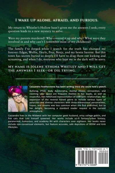 I wake up alone, afraid, and furious. My return to Whistler's Hollow hasn't given me the answers I seek; every question leads to a new mystery to solve. Were my parents murdered? Who covered it up and why? What were they involved in and why can't I remember most of my childhood? The family I've forged while I search for the truth has changed me forever: Edgar, Wolfie, Doyle, Prez, Benjy, and my bestie Saoirse. But this town has secrets buried so deeply I'll have to drag them out kicking and screaming, and when I do, everyone who kept me in the dark will be sorry. My name is Jolene Athena Whitley and I will get the answers I seek--or die trying.