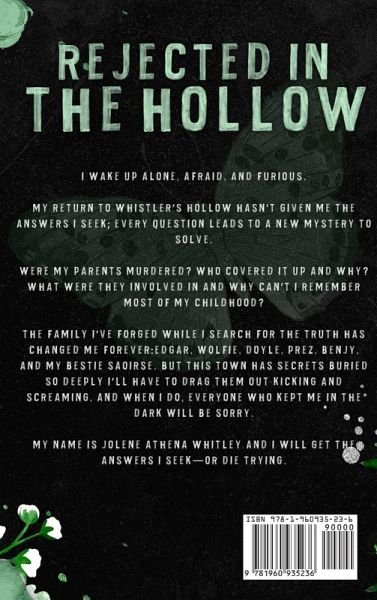 I wake up alone, afraid, and furious. My return to Whistler's Hollow hasn't given me the answers I seek; every question leads to a new mystery to solve. Were my parents murdered? Who covered it up and why? What were they involved in and why can't I remember most of my childhood? The family I've forged while I search for the truth has changed me forever: Edgar, Wolfie, Doyle, Prez, Benjy, and my bestie Saoirse. But this town has secrets buried so deeply I'll have to drag them out kicking and screaming, and when I do, everyone who kept me in the dark will be sorry. My name is Jolene Athena Whitley and I will get the answers I seek--or die trying.