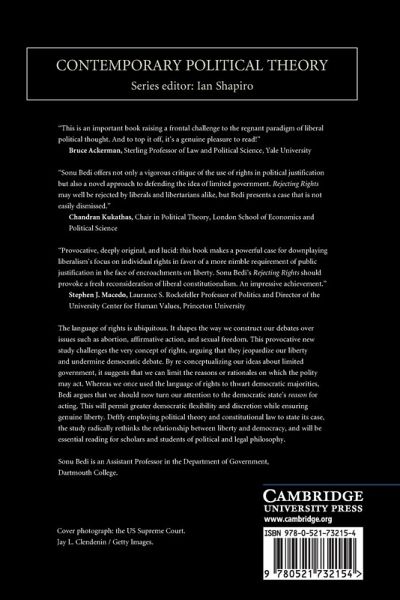 The language of rights is ubiquitous. It shapes the way we construct our debates over issues such as abortion, affirmative action and sexual freedom. This provocative new study challenges the very concept of rights, arguing that they jeopardize our liberty and undermine democratic debate. By re-conceptualizing our ideas about limited government, it suggests that we can limit the reasons or rationales on which the polity may act. Whereas we once used the language of rights to thwart democratic majorities, Bedi argues that we should now turn our attention to the democratic state's reason for acting. This will permit greater democratic flexibility and discretion while ensuring genuine liberty. Deftly employing political theory and constitutional law to state its case, the study radically rethinks the relationship between liberty and democracy, and will be essential reading for scholars and students of political and legal philosophy.