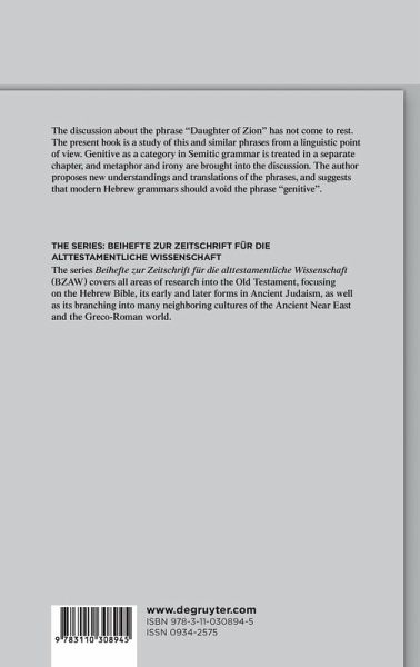 The present book seeks to remedy this defect by treating all relevant expressions from a linguistic point of view. To do this, it also discusses the understanding of Hebrew construct phrases, and finds that while there is a morphological category of genitive in Akkadian, Ugaritic and Arabic, Hebrew, Aramaic and Syriac do not display it. The use of this term as a syntactical category is unfortunate, and the term should be avoided in Hebrew grammar. Metaphor theory and the use of irony are also tools in the discussion of the phrases.