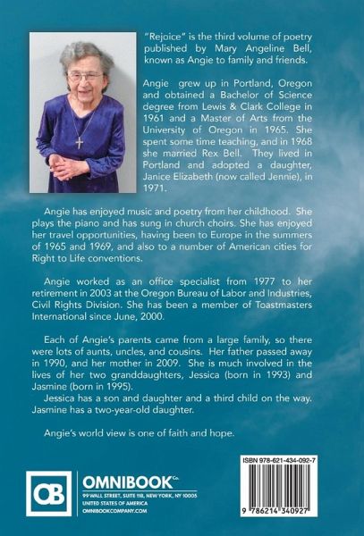 "Rejoice" is the third volume of poetry published by Mary Angeline Bell, known as Angie to family and friends. Angie grew up in Portland, Oregon and obtained a Bachelor of Science degree from Lewis & Clark College in 1961 and a Master of Arts from the University of Oregon in 1965. She spent some time teaching, and in 1968 she married Rex Bell. They lived in Portland and adopted a daughter, Janice Elizabeth (now called Jennie), in 1971. Angie has enjoyed music and poetry from her childhood. She plays the piano and has sung in church choirs. She has enjoyed her travel opportunities, having been to Europe in the summers of 1965 and 1969, and also to a number of American cities for Right to Life conventions. Angie worked as an office specialist from 1977 to her retirement in 2003 at the Oregon Bureau of Labor and Industries, Civil Rights Division. She has been a member of Toastmasters International since June, 2000. Each of Angie's parents came from a large family, so there were lots of aunts, uncles, and cousins. Her father passed away in 1990, and her mother in 2009. She is much involved in the lives of her two granddaughters, Jessica (born in 1993) and Jasmine (born in 1995). Jessica has a son and daughter and a third child on the way. Jasmine has a two-year-old daughter. Angie's world view is one of faith and hope.