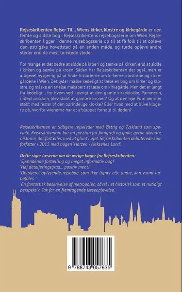 Rejseskribenten Rejser Til... Wiens kirker, klostre og kirkegårde er den femte og sidste bog i Rejseskribentens rejsebogsserie om Wien. Rejseskribenten ligger i denne rejsebogsserie op til at få folk til at opleve den østrigske hovedstad på en anden måde, og turde opleve andre steder end de mest turistede steder. For mange er det bedre at sidde på kroen og tænke på kirken, end at sidde i kirken og tænke på kroen. Sådan har Rejseskribenten det også, men er alligevel nysgerrig på at finde historierne om kirkerne, klostrene og kirkegårdene i Wien. Det lyder måske kedeligt at læse en bog om kirker og klostre, og måske en anelse makabert at læse om kirkegårde. Men det er langt fra kedeligt... for hvem ved i øvrigt at den gamle kirkeklokke, Pummerin, i Stephansdom, blev støbt at gamle kanoner? Og at den nye Pummerin er støbt med rester af den oprindelige klokke? Eller hvad med at blive klogere på, hvorfor wienerne har et afslappet forhold til døden? Rejseskribenten er tidligere rejseleder med Østrig og Tyskland som speciale. Rejseskribenten har en passion for fotografi og gode, gerne ukendte, historier, der fortælles med et glimt i øjet. Rejseskribenten debuterede som forfatter i 2015 med bogen 'Harzen - Heksenes Land'. Dette siger læserne om de øvrige bøger fra Rejseskribenten: 'Spændende fortælling og meget informativ bog!' 'Høj detaljeringsgrad... positiv ment!' 'Detaljeret oplysende rejsebog, som ikke ligner alle andre, kan varmt anbefales...' 'En fantastisk beskrivelse af metropolen, såvel i et historisk som et nutidigt perspektiv. Tak for en fremragende læseoplevelse.'