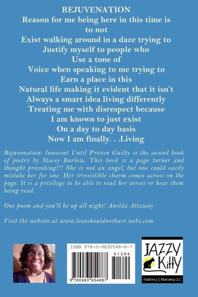 Dear Reader: What you are about to witness is a most profound journey to the other side of relationships when one person in a relationship wants things one way when in reality, the other individual involved does not reciprocate the same type of feelings. This can become the most dangerous yet provoking kind of relationship ever known to man. Rejuvenation: Innocent Until Proven Guilty is a fact of life to most people and a fantasy for some. Women can love hard and it is said that men are incapable of loving. This type of love can possibly lead to death if not taken precautions the correct way. Through words of poetry, you will find, joy, pain, happiness and strength and lead you away from the dangers of obsession. Men can love just as hard. Rejuvenation: Innocent Until Proven Guilty is an in-depth look at a deeper side of love that has a true beauty as well. It's all right to love...it's not all right to love someone to death. Stop the madness. tacey