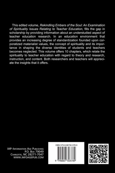 This edited volume, Rekindling Embers of the Soul: An Examination of Spirituality Issues Relating to Teacher Education, fills the gap in scholarship by providing information about an understudied aspect of teacher education research. In an education environment that provides an increasing degree of standardization founded upon corporatized materialist values, the concept of spirituality and its importance in shaping the diverse identities of students and teachers becomes neglected. This volume offers ten chapters, which relate the spirituality to teacher education with regard to theory and research, instruction, and content. Both researchers and teachers will appreciate the insights that it offers.