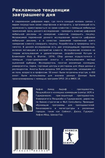 V sowremennom cifrowom mire, gde pochti kazhdyj chelowek swqzan s mirom posredstwom swoih smartfonow i interneta, u organizacij est' wozmozhnost' orientirowat'sq na swoih klientow s pomosch'ü mobil'nyh prilozhenij. Cel' dannogo issledowaniq - prowerit' wliqnie cifrowoj mobil'noj reklamy na namerenie klientow sowershit' pokupku. Nezawisimoj peremennoj dannogo issledowaniq qwlqetsq cifrowaq mobil'naq reklama, a w kachestwe zawisimoj peremennoj wzqto namerenie klienta sowershit' pokupku. Razrabotany i prowereny pqt' gipotez. V dannom issledowanii est' dwe oposreduüschie peremennye, wklüchaq motiwaciü i wospriqtie klienta. Issledowanie osnowano na teorii ispol'zowaniq i udowletworeniq, razrabotannoj Katcem i Blümlerom (Katz & Blumler, 1974). Sbor dannyh osuschestwlqlsq s pomosch'ü strukturirowannoj ankety s ispol'zowaniem metoda ocenochnoj wyborki. Issledowatel' posetil razlichnye kolledzhi, uniwersitety, parki, torgowye centry i restorany dlq sbora dannyh u respondentow. Ankety byli rozdany 500 respondentam, nezawisimo ot ih pola, wozrasta i professii. 50 anket byli potracheny wpustuü, a 450 anket byli ispol'zowany dlq analiza dannyh. Dannye byli proanalizirowany s pomosch'ü programm SPSS 20 i AMOS 18.