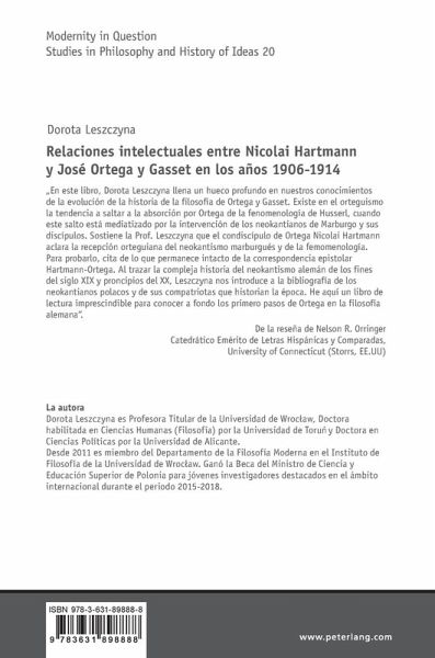 ¿En este libro, Dorota Leszczyna llena un hueco profundo en nuestros conocimientos de la evolución de la historia de la filosofía de Ortega y Gasset. Existe en el orteguismo la tendencia a saltar a la absorción por Ortega de la fenomenología de Husserl, cuando este salto está mediatizado por la intervención de los neokantianos de Marburgo y sus discípulos. Sostiene la Prof. Leszczyna que el condiscípulo de Ortega Nicolai Hartmann aclara la recepción orteguiana del neokantismo marburgués y de la femomenología. Para probarlo, cita de lo que permanece intacto de la correspondencia epistolar Hartmann-Ortega. Al trazar la compleja historia del neokantismo alemán de los fines del siglo XIX y proncipios del XX, Leszczyna nos introduce a la bibliografía de los neokantianos polacos y de sus compatriotas que historian la época. He aquí un libro de lectura imprescindible para conocer a fondo los primero pasos de Ortega en la filosofía alemanä. De la reseña de Nelson R. Orringer Catedrático Emérito de Letras Hispánicas y Comparadas, University of Connecticut (Storrs, EE.UU)