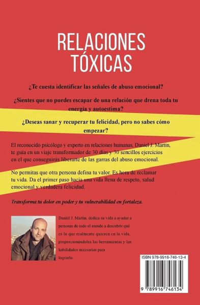 ¿Te cuesta identificar las señales de abuso emocional? ¿Sientes que no puedes escapar de una relación que drena toda tu energía y autoestima? ¿Deseas sanar y recuperar tu felicidad, pero no sabes cómo empezar? Descubre la guía definitiva para liberarte del dolor y abrir un nuevo capítulo en tu vida. El reconocido psicólogo y experto en relaciones humanas, Daniel J. Martin, te guía en un viaje transformador de 30 días y 30 sencillos ejercicios en el que conseguirás liberarte de las garras del abuso emocional. En solo 30 días, aprenderás a: Identificar: Reconocer las señales de alerta y los patrones de comportamiento de las personas tóxicas. Escapar: Desarrollar estrategias efectivas para liberarte física y emocionalmente de relaciones dañinas. Sanar: Reconstruir tu autoestima y sanar las heridas emocionales, preparándote para futuras relaciones saludables. Este libro es para ti si: Sientes que tu relación actual te está robando tu alegría y autoestima. Te sientes atrapado en una relación que no te hace feliz. Te cuesta diferenciar el amor saludable del apego tóxico. Deseas reconstruir tu autoestima y recuperar tu libertad emocional. Temes dejar una relación tóxica por no saber cómo enfrentar la vida en solitario. Quieres aprender a establecer límites claros con personas manipuladoras. Anhelas vivir libre de control y manipulación. Transforma tu dolor en poder y tu vulnerabilidad en fortaleza. No permitas que otra persona defina tu valor. Es hora de reclamar tu vida. Da el primer paso hacia una vida llena de respeto, salud emocional y verdadera felicidad. Consigue tu copia de "Relaciones Tóxicas" HOY y transforma tu vida en 30 días.