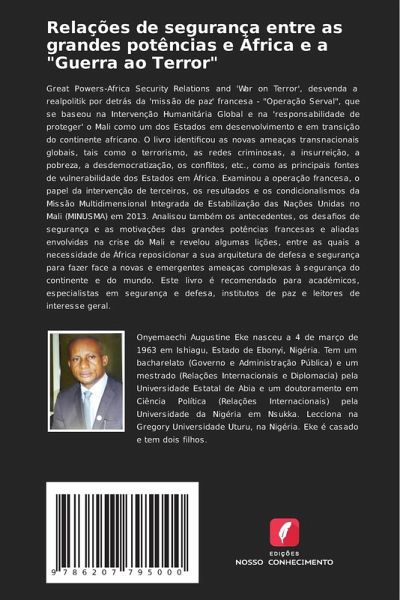 Great Powers-Africa Security Relations and 'War on Terror', desvenda a realpolitik por detrás da 'missão de paz' francesa - "Operação Serval", que se baseou na Intervenção Humanitária Global e na 'responsabilidade de proteger' o Mali como um dos Estados em desenvolvimento e em transição do continente africano. O livro identificou as novas ameaças transnacionais globais, tais como o terrorismo, as redes criminosas, a insurreição, a pobreza, a desdemocratização, os conflitos, etc., como as principais fontes de vulnerabilidade dos Estados em África. Examinou a operação francesa, o papel da intervenção de terceiros, os resultados e os condicionalismos da Missão Multidimensional Integrada de Estabilização das Nações Unidas no Mali (MINUSMA) em 2013. Analisou também os antecedentes, os desafios de segurança e as motivações das grandes potências francesas e aliadas envolvidas na crise do Mali e revelou algumas lições, entre as quais a necessidade de África reposicionar a sua arquitetura de defesa e segurança para fazer face a novas e emergentes ameaças complexas à segurança do continente e do mundo. Este livro é recomendado para académicos, especialistas em segurança e defesa, institutos de paz e leitores de interesse geral.
