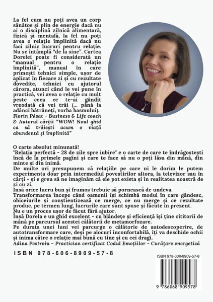 O carte absolut minunat¿! "Reläia perfect¿ - 28 de zile spre iubire" e o carte de care te îndr¿goste¿ti înc¿ de la primele pagini ¿i care te face s¿ nu o pöi l¿sa din mân¿, din minte ¿i din inim¿. De multe ori presupunem c¿ reläiile pe care ni le dorim le putem experimenta doar prin intermediul povestirilor altora, la televizor sau în c¿r¿i - ¿i e greu s¿ ne imagin¿m c¿ ele pot exista ¿i în realitatea noastr¿ de zi cu zi. Îns¿ orice lucru bun ¿i frumos trebuie s¿ porneasc¿ de undeva. Transformarea începe când oamenii î¿i schimb¿ modul în care gândesc, obiceiurile ¿i con¿tientizeaz¿ ce merge, ce nu merge ¿i ce rezultate produc, pe termen lung, lucrurile care sunt spuse ¿i f¿cute în prezent. Nu e un proces üor de f¿cut f¿r¿ ajutor. Îns¿ Dorela e un ghid excelent - cu blânde¿e ¿i eficien¿¿ î¿i ¿ine cititorii de mân¿ pe parcursul acestei c¿l¿torii de metamorfozare. Pe durata unei luni vei parcurge o c¿l¿torie de autodescoperire, de autotransformare care, de¿i pe alocuri inconfortabil¿, î¿i va deschide ochii ¿i inima c¿tre o reläie mai bun¿ cu tine ¿i cu cei dragi. Adina Pestroiu - Practician certificat Codul Emöiilor - Cur¿¿are energetic¿ ¿La fel cum nu pöi avea un corp s¿n¿tos ¿i plin de energie dac¿ nu ai o disciplin¿ zilnic¿ alimentar¿, fizic¿ ¿i mental¿, la fel nu pöi avea o reläie împlinit¿ dac¿ nu faci zilnic lucruri pentru reläie. Nu se întâmpl¿ "de la sine". Cartea Dorelei poate fi considerat¿ un "manual pentru o reläie împlinit¿", manual în care prime¿ti tehnici simple, üor de aplicat în fiecare zi ¿i cu rezultate dovedite, tehnici cu ajutorul c¿rora, atunci când le vei pune în practic¿, vei avea o reläie cu mult peste ceea ce te-ai gândit vreodat¿ c¿ vei tr¿i (... pân¿ la adânci b¿trâne¿i, vorba basmului). Florin P¿sat - Business & Life coach & Autorul c¿r¿ii "WOW! Noul ghid ca s¿ tr¿ie¿ti acum o viä¿ abundent¿ ¿i împlinit¿"
