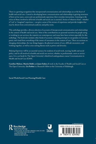This reader provides a diverse selection of accounts of interpersonal communication and relationships in the context of health and social care. Most of the contributions are personal narratives by people using or working in care services; the majority are contemporary and many have been written especially for this anthology. The book also includes other kinds of accounts, including attempts to encapsulate in fictional, poetic and visual form something of the nature of encounters in the context of care. There are sections on changing relationships, the way things happen, the physical context of care, difficult encounters, and working together, as well as cross-cutting themes such as power and diversity. Relating Experience is an essential resource for students of social work, nursing, health and social policy, and for all involved in health and social care services, whether as professionals, carers or service users.