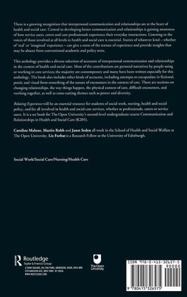 This reader provides a diverse selection of accounts of interpersonal communication and relationships in the context of health and social care. Most of the contributions are personal narratives by people using or working in care services; the majority are contemporary and many have been written especially for this anthology. The book also includes other kinds of accounts, including attempts to encapsulate in fictional, poetic and visual form something of the nature of encounters in the context of care. There are sections on changing relationships, the way things happen, the physical context of care, difficult encounters, and working together, as well as cross-cutting themes such as power and diversity. Relating Experience is an essential resource for students of social work, nursing, health and social policy, and for all involved in health and social care services, whether as professionals, carers or service users.