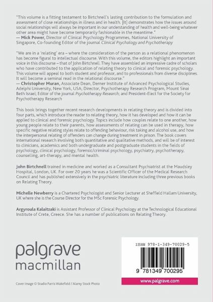 Part I: Introduction to Relating Theory.- Chapter 1. What is Relating Theory?;John Birtchnell.- Chapter 2. Comparing Birtchnell's Octagon with Leary's Circle;John Birtchnell.- Part II: Measures Based on Relating Theory.- Chapter 3. The Person's Relating to Others Questionnaire (PROQ); Argyroula Kalaitzaki & John Birtchnel.- Chapter 4. The Psychometric Viability of the Person's Relating to Others Questionnaire (PROQ);Sean Hammond.- Chapter 5. The Couple's Relating to Each Other Questionnaire (CREOQ): A Measure of Negative Interrelating; Argyroula Kalaitzaki & John Birtchnell.- Chapter 6. The Us as a Couple Questionnaire (US): A Unidimensional Measure of Couple Satisfaction;Cor de Jong, Laura DeFuentes-Merillas, Florieke van de Werken & John Birtchnell.- Chapter 7. The Family Members Interrelating Questionnaire (FMIQ): A Measure of Interrelating between Young Adults and their Parents;Argyroula Kalaitzaki.- Chapter 8. Parental Relating: A New Conceptualisation of Parenting Styles and the Development of the Adult Recollection of Parental Relating Questionnaire (ARPRQ); Cristina Harnagea.- Chapter 9. The Person's Relating Interview (PRI) and the Observation of Relating Behaviour (ORB): Observers' Perceptions of Other People's Interpersonal Relating; Argyroula Kalaitzaki, Michelle Newberry & John Birtchnell.- Chapter 10. The Person's Relating to Others at Work Questionnaire (PROWQ): A Modified Version of the PROQ Applied to Job Sharing at Senior Levels in the Workplace; Lucy Daniels.- Chapter 11. The Person's Positive Relating to Others Questionnaire (PPROQ): A New Relating Instrument Grounded in Positive Psychology; Argyroula Kalaitzaki & Sean Hammond.- Part III: Applications of Relating Theory to Clinical Psychology.- Chapter 12. Relating Therapy; John Birtchnell.- Chapter 13. Negative Relating and Psychotherap; Argyroula Kalaitzaki & John Birtchnell.- Chapter 14. The Use of the Couple's Relating to Each Other Questionnaire (CREOQ) in Couple Therapy;Deidre Gordon.- Chapter 15. Interrelating Within the Families of Schizophrenics Before Their First Psychotic Episode; Joannis Nestoros, Theodora Seliniotaki, Anastasia Vergoti & Emmanouil Benioudakis.- Chatper 16. Relatedness Reflected Through the Group Analytic Mirror; Marion Brown.- Chapter 17. Changes in Interrelating Over the Course of Psychotherapy; Argyroula Kalaitzaki.- Part IV: Applications of Relating theory to Forensic Psychology.- Chapter 18. Are Specific Criminal Offences Associated with Particular Negative Interpersonal Relating Styles?; Michelle Newberry & John Birtchnell.- Chapter 19. Interpersonal Relating, Risk Taking Behaviour and Alcohol Use in Young Adults; Lydia de Haan, Hein de Haan, Eibert Heerdink & Cor de Jong.- Chapter 20. Negative Relating and Psychopathy; Michelle Newberry.- Chapter 21. The Sadistic Impulse and Relating to Others; Aisling O'Meara & Sean Hammond.- Chapter 22. Using the Person's Relating to Others Questionnaire (PROQ) to Support Offenders with Intellectual Disability and Personality Disorder; Jon Taylor.- Chapter 23. Changes in Offenders Interpersonal Relating Style Following Treatment in Forensic Settings; Michelle Newberry.- Chapter 24. Further Directions for Research in Relating Theory and Practice; Argyroula Kalaitzaki, Michelle Newberry & John Birtchnell