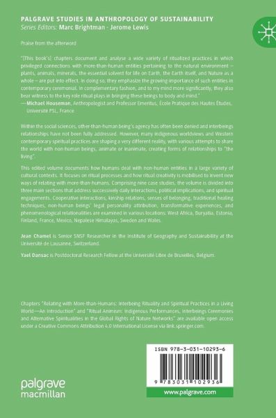 This edited volume documents how humans deal with non-human entities in a large variety of cultural contexts. It focuses on ritual processes and how ritual creativity is mobilised to invent new ways of relating with more-than-humans. Comprising nine case studies, the volume is divided into three main sections that address successively daily interactions, political implications, and spiritual engagements. Cooperative interactions, kinship relations, senses of belonging, traditional healing techniques, non-human beings' legal personality attribution, transformative experiences,and phenomenological relationalities are examined in various locations: West Africa, Buryatia, Estonia, Finland, France, Mexico, Nepalese Himalayas, Sweden and Wales.