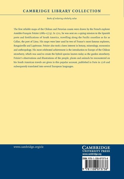 The first reliable maps of the Chilean and Peruvian coasts were drawn by the French explorer Amédée-François Frézier (1682-1773). In 1712, he was sent on a spying mission to the Spanish ports and fortifications of South America, travelling along the Pacific coastline as far as Callao, the port of Lima. His maps were later used by two of France's most famous explorers, Bougainville and Lapérouse. Frézier also took a keen interest in botany, mineralogy, economics and anthropology. His most celebrated achievement is the introduction to Europe of the Chilean strawberry, which was used to create the hybrid species known today as the garden strawberry. Frézier's observations and illustrations of the people, plants and animals he encountered on his South American travels are given in this popular account, published in Paris in 1716 and subsequently translated into several European languages.