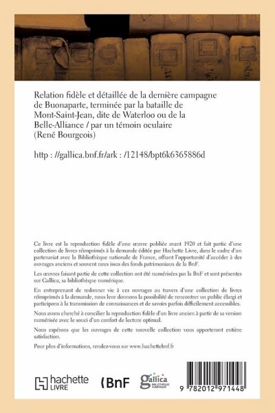 Relation fidèle et détaillée de la dernière campagne de Buonaparte, terminée par la bataille de Mont-Saint-Jean, dite de Waterloo ou de la Belle-Alliance / par un témoin oculaire (René Bourgeois) Date de l'édition originale: 1815 Le présent ouvrage s'inscrit dans une politique de conservation patrimoniale des ouvrages de la littérature Française mise en place avec la BNF. HACHETTE LIVRE et la BNF proposent ainsi un catalogue de titres indisponibles, la BNF ayant numérisé ces oeuvres et HACHETTE LIVRE les imprimant à la demande. Certains de ces ouvrages reflètent des courants de pensée caractéristiques de leur époque, mais qui seraient aujourd'hui jugés condamnables. Ils n'en appartiennent pas moins à l'histoire des idées en France et sont susceptibles de présenter un intérêt scientifique ou historique. Le sens de notre démarche éditoriale consiste ainsi à permettre l'accès à ces oeuvres sans pour autant que nous en cautionnions en aucune façon le contenu. Pour plus d'informations, rendez-vous sur www.hachettebnf.fr