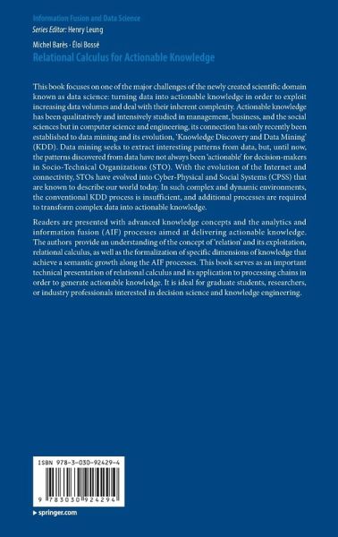 Readers are presented with advanced knowledge concepts and the analytics and information fusion (AIF) processes aimed at delivering actionable knowledge. The authors provide an understanding of the concept of 'relation' and its exploitation, relational calculus, as well as the formalization of specific dimensions of knowledge that achieve a semantic growth along the AIF processes. This book serves as an important technical presentation of relational calculus and its application to processing chains in order to generate actionable knowledge. It is ideal for graduate students, researchers, or industry professionals interested in decision science and knowledge engineering.