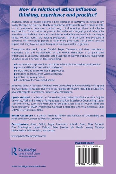 Relational Ethics in Practice presents a new collection of narratives on ethics in day-to-day therapeutic practice. Highly experienced professionals from a range of roles in the therapeutic professions explore ways of developing ethical and effective relationships. The contributors provide the reader with engaging and informative narratives that indicate how ethics can inform and influence practice in a variety of clinical contexts across the helping professions. These personal and professional narratives will encourage people to think more proactively about ethics and the impact that they have on both therapeutic practice, and life in general. Throughout this book, Lynne Gabriel, Roger Casemore and their contributors emphasise that the consideration of the ethical dimension is of paramount importance to successful processes and outcomes in every therapeutic relationship. Chapters cover a number of topics including: how theoretical approaches can inform ethical decision making and practice practical difficulties and ethical challenges innovative and unconventional approaches informed consent across various contexts pointers for good practice the notion of the 'wounded healer'. Relational Ethics in Practice: Narratives from Counselling and Psychotherapy will appeal to a wide range of readers involved in the helping professions including counsellors, psychotherapists, researchers, supervisors and trainees.