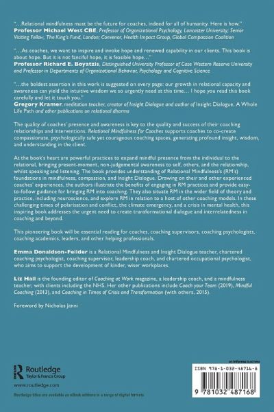 Emma Donaldson-Feilder is a Relational Mindfulness and Insight Dialogue teacher, chartered coaching psychologist, coaching supervisor, leadership coach, and chartered occupational psychologist, who aims to support the development of kinder, wiser workplaces. Liz Hall is the founding editor of Coaching at Work magazine, a leadership coach, and a mindfulness teacher, with clients including the NHS. Her other publications include Coach your Team (2019), Mindful Coaching (2013), and Coaching in Times of Crisis and Transformation (with others, 2015). Foreword by Nicholas Janni