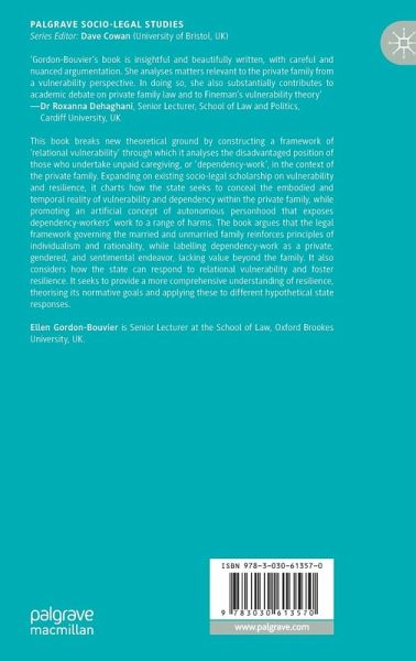 This book breaks new theoretical ground by constructing a framework of 'relational vulnerability' through which it analyses the disadvantaged position of those who undertake unpaid caregiving, or 'dependency-work', in the context of the private family. Expanding on existing socio-legal scholarship on vulnerability and resilience, it charts how the state seeks to conceal the embodied and temporal reality of vulnerability and dependency within the private family, while promoting an artificial concept of autonomous personhood that exposes dependency-workers work to a range of harms. The book argues that the legal framework governing the married and unmarried family reinforces principles of individualism and rationality, while labelling dependency-work as a private, gendered, and sentimental endeavor, lacking value beyond the family. It also considers how the state can respond to relational vulnerability and foster resilience. It seeks to provide a more comprehensive understanding of resilience, theorising its normative goals and applying these to different hypothetical state responses.