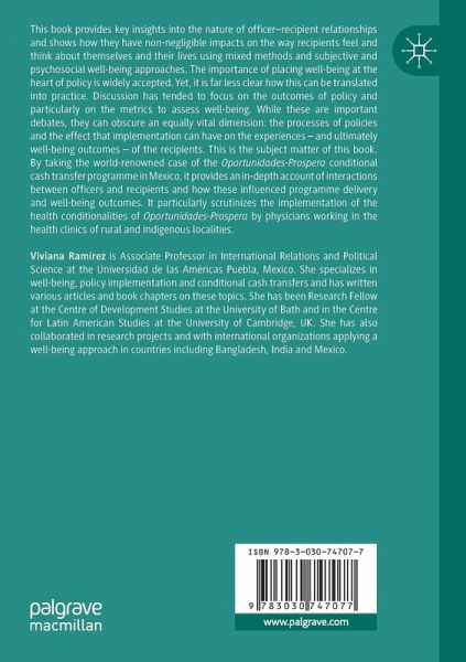 This book provides key insights into the nature of officer-recipient relationships and shows how they have non-negligible impacts on the way recipients feel and think about themselves and their lives using mixed methods and subjective and psychosocial well-being approaches. The importance of placing well-being at the heart of policy is widely accepted. Yet, it is far less clear how this can be translated into practice. Discussion has tended to focus on the outcomes of policy and particularly on the metrics to assess well-being. While these are important debates, they can obscure an equally vital dimension: the processes of policies and the effect that implementation can have on the experiences - and ultimately well-being outcomes - of the recipients. This is the subject matter of this book. By taking the world-renowned case of the Oportunidades-Prospera conditional cash transfer programme in Mexico, it provides an in-depth account of interactions between officers and recipients and how these influenced programme delivery and well-being outcomes. It particularly scrutinizes the implementation of the health conditionalities of Oportunidades-Prospera by physicians working in the health clinics of rural and indigenous localities.