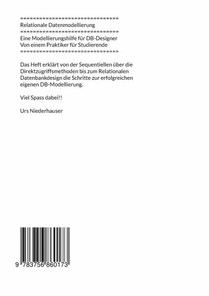===========================Relationale Datenmodellierung ===========================Eine Modellierungshilfe für DB-DesignerVon einem Praktiker für Studierende===========================Das Heft erklärt von der Sequentiellen über die Direktzugriffsmethoden bis zum Relationalen Datenbankdesign die Schritte zur erfolgreichen eigenen DB-Modellierung.Viel Spass dabei!! Urs Niederhauser