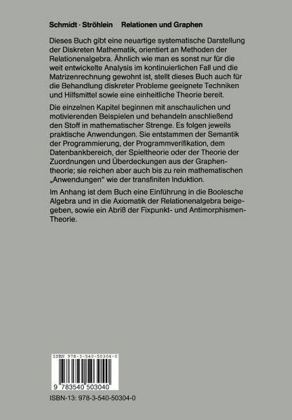 Dieses Buch gibt eine neuartige systematische Darstellung der Diskreten Mathematik; sie orientiert sich an Methoden der Relationenalgebra. Ähnlich wie man es sonst nur für die weit entwickelte Analysis im kontinuierlichen Fall und die Matrizenrechnung gewohnt ist, stellt dieses Buch auch für die Behandlung diskreter Probleme geeignete Techniken und Hilfsmittel sowie eine einheitliche Theorie bereit. Die einzelnen Kapitel beginnen jeweils mit anschaulichen und motivierenden Beispielen und behandeln anschließend den Stoff in mathematischer Strenge. Es folgen jeweils praktische Anwendungen. Diese entstammen der Semantik der Programmierung, der Programmverifikation, dem Datenbankbereich, der Spieltheorie oder der Theorie der Zuordnungen und Überdeckungen aus der Graphentheorie; sie reichen aber auch bis zu rein mathematischen "Anwendungen" wie der transfiniten Induktion. Im Anhang ist dem Buch eine Einführung in die Boolesche Algebra und in die Axiomatik der Relationenalgebra beigegeben, sowie ein Abriß der Fixpunkt- und Antimorphismen-Theorie.