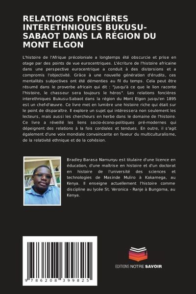 L'histoire de l'Afrique précoloniale a longtemps été obscurcie et prise en otage par des points de vue eurocentriques. L'écriture de l'histoire africaine dans une perspective eurocentrique a conduit à des distorsions et a compromis l'objectivité. Grâce à une nouvelle génération d'érudits, ces mentalités subjectives ont été démenties au fil du temps. Cela peut être résumé dans le proverbe africain qui dit : "jusqu'à ce que le lion raconte l'histoire, le chasseur sera toujours le héros". Les relations foncières interethniques Bukusu-Sabaot dans la région du Mont Elgon jusqu'en 1895 est un chef-d'oeuvre. Ce livre met en lumière une histoire riche qui était sur le point de disparaître. Il explore un sujet qui intéressera non seulement les lecteurs, mais aussi les chercheurs en herbe dans le domaine de l'histoire. Ce livre a réveillé les liens socio-écono-politiques pré-modernes qui dépeignent des relations à la fois cordiales et tendues. En outre, il s'agit également d'une voix mondiale convaincante en faveur du multiculturalisme, de la relativité ethnique et de la cohésion.