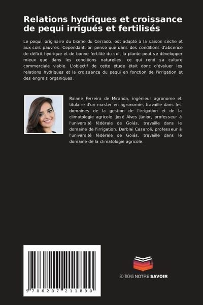 Le pequi, originaire du biome du Cerrado, est adapté à la saison sèche et aux sols pauvres. Cependant, on pense que dans des conditions d'absence de déficit hydrique et de bonne fertilité du sol, la plante peut se développer mieux que dans les conditions naturelles, ce qui rend sa culture commerciale viable. L'objectif de cette étude était donc d'évaluer les relations hydriques et la croissance du pequi en fonction de l'irrigation et des engrais organiques.
