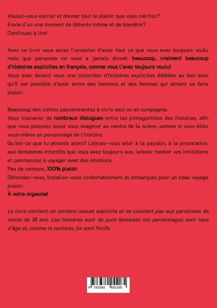 Voulez-vous exciter et donner tout le plaisir que vous méritez?Envie d'un vrai moment de détente intime et de bienêtre?Continuez à lire!Avec ce livre vous aurez l'occasion d'avoir tout ce que vous avez toujours voulu mais que personne ne vous a jamais donné: beaucoup, vraiment beaucoup d'histoires explicites en français, comme vous l'avez toujours voulu!Vous avez devant vous une collection d'histoires explicites dédiées au bon sexe qu'il est possible d'avoir entre des hommes et des femmes qui aiment se faire plaisir. Beaucoup des contes passionnantes à vivre seul ou en compagnie.Vous trouverez de nombreux dialogues entre les protagonistes des histoires, afin que vous puissiez aussi vous imaginer au centre de la scène, comme si vous étiez vous-même un personnage de l'histoire.Qu'est-ce que tu attends alors? Laissez-vous aller à la passion, à la provocation, aux fantasmes interdits que vous avez toujours eus, laissez tomber vos inhibitions et commencez à voyager avec des émotions.Pas de censure, 100 pour 100 de plaisir.Détendez-vous, installez-vous confortablement et embarquez pour un beau voyage plaisir.À votre orgasme!